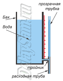 Если на расходную трубку навинтить тройник, а к одному его концу приделать тонкую прозрачную трубку, то уровень воды в этой трубке будет такой же как и в баке. Дачник, заметив, что уровень в баке низкий, включает насос и наполняет бак, отслеживая при этом уровень наполнения.