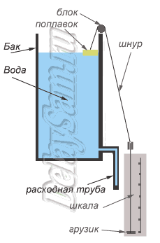 Дистанционный механический измеритель уровня воды состоит из тяжёлого, но все же плавучего поплавка, небольшого блока на краю бака, тонкого и крепкого шнура и грузика. Один конец шнура пропущен через блок и привязан к поплавку. Поплавок можно сделать из небольшого бруска древесины с приклеенным к нему кусочком пенопласта. Такой поплавок будет достаточно тяжелым, но иметь положительную плавучесть. Другой кончик шнура может быть пропущен через направляющие (они представляют собой колечки или короткие обрезки трубок, шланга и т.д.). На кончике шнура висит небольшой грузик.