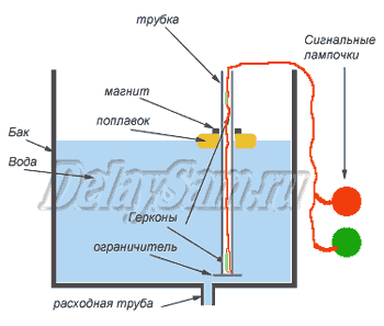 Крайние герконы уже могут служить для управления насосом, которые будут вовремя пополнять бак водой из колодца или скважины. Как понимаете, сигнальные лампочки могут быть расположены где угодно.