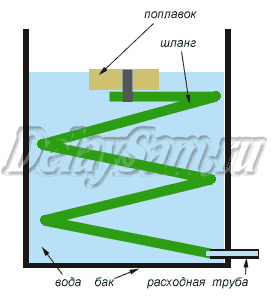 При изменении уровня воды поплавок опускается и тянет за собой шнурок, а тот, в свою очередь — грузик. Расположив вдоль траектории движения грузика шкалу и разметив ее, дачник всегда может с достаточно точно узнать, сколько воды в баке. Длина шнурка может быть достаточно большой — 10-20 метров. Главное, что бы ничто не мешало его перемещению. Его можно даже заключить в специальную гофрированную пластиковую трубку — кабель-канал, предназначенную для устройства скрытой электропроводки. Для облегчения скольжения шнурок нужно натереть мылом или стеариновой свечкой.