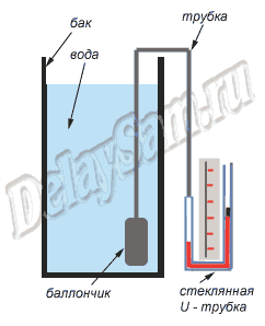 Между тем, узнать температуру воды в баке можно с помощью следующего простого устройства, который вы можете сделать сами. Необходимо взять небольшой металлический баллончик — 0,5 литра будет вполне достаточно и герметично приделать к нему тонкую трубочку. В идеале — металлическую, но подойдет и из любого упругого материала. На свободном краю трубочки устанавливается «U»-образная стеклянная трубочка. Можно придать такую форму и прозрачному шлангу и закрепить его на кусочке фанеры. Когда в баке самая холодная вода, в трубочку заливают немного подкрашенной воды, и несколько капель машинного масла (что бы вода не испарялась). Баллончик пригружается балластом, что бы не всплывал.