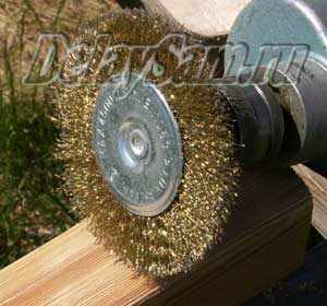 Существует достаточно простой и эффективный способ придать дереву стариынный вид, состарить его искусственно. Для этого нам потребуется электродрель средней мощности и проволочная щетка.