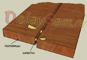 Дрелью в половице сверлят отверстие под большим наклоном и так, что бы оно проходило и через соседнюю доску. В отверстие забивают смазанный клеем ПВА шкант, что бы он наполовину остался в доске, с которой начиналось сверление, а наполовину – в соседней. Если вы используете толстую проволоку или отрезки гвоздей, может возникнуть соблазн отказаться от сверления и заколачивать гвозди наискосок непосредственно. Ни в коем случае нельзя этого делать! Вы только расколете края половых досок и еще больше усугубите ситуацию. Сверлить надо всегда.
