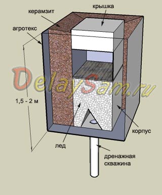 В грунте выкапывается яма глубиной в 2 -2,5 метра, и размером стороны 1,5 – 2 метра. На дне ямы бурится дренажная скважина метра 2-3 глубиной и устраивается дренаж для воды, которая будет образовываться при таянии льда. Дренажную скважину можно устроить примерно так.