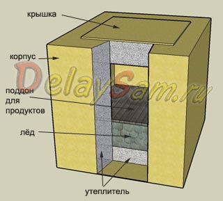 Вобщем то это та же конструкция, что и ледник в земле, только оформленная в виде ларя. Так же устроен и любой морозильник – ларь.