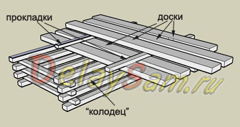 Назначение опор штабеля – поднять над землей (полом) самые нижние прокладки (на которые укладывается самый первый, самый нижний ряд досок). Опоры штабеля могут быть разной конструкции. Простая и надежная конструкция – «колодец» сложенный из брусочков сечением 50х50 мм и длиной 0,5 метра. Выкладываем два колодца высотой 0,7 метра, кладем на них нижнюю опорную прокладку (сечение не менее 60х80 мм) – вот и готова одна опора. Расстояние между опорами по длине штабеля – 1,5 метра. Окончательный этап подготовки опор – выверка. Провести выверку значит сделать так, чтобы верхние поверхности опорных прокладок оказались в одной плоскости и совсем хорошо, если эта плоскость окажется еще и горизонтальной. В нашем случае качественной выверки можно достичь при помощи щепочек – подкладочек. Если мы устанавливаем штабель на грунте (не на полу), то разумеется , при каждой закладке новой партии пиломатериала выверку необходимо проводить заново. В случае если вы планируете сушить пиломатериал регулярно, имеет смысл сварить металлические козлы-опоры и даже забетонировать площадку под штабель.