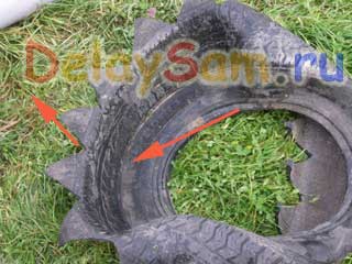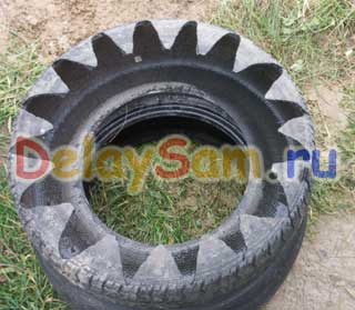 Как известно, внутри покрышки, под ее протектором (рисунком) находится прочный металлический корд. Он нам, вобщем то не по зубам, но и мешать сильно не будет. А будет, т.с. естественной границей, до которой следует сделать надрезы в боковине покрышки. Надрезы делаются по радиусу покрышки ( от центра к протектору ). Ширина между надрезами – на ваш вкус, но желательно не реже 8-10 см. Форма надрезов — тоже по вашему усмотрению. Можно их сделать треугольными, полукруглыми, прямоугольными… Резина между этими надрезами потом образует «лепестки» вазона. Поэтому проще всего сначала просто сделать прямые надрезы, а уж затем, когда лепестки окажутся снаружи, придать им нужную форму с помощью ножа или мощных ножниц.