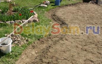 Разумеется, прежде всего надо было сформировать русло будущего ручья. Это делается обычной лопатой, путем выкапывания канавки глубиной примерно в 1 штык. Сформировал относительно пологие берега, что бы они не обваливались. Грунт тщательно утрамбовал ногами по бокам канавки, а дно — простой деревянной трамбовкой.