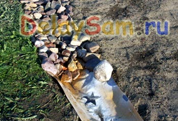 Не важно так же и наличие рисунка на пленке — она все равно вся закладывается камнями и совершенно не видна впоследствии. Камни — «местные», в изобилие вылезающие из земли после каждой зимы. Их все равно приходится собирать, что бы они не угробили газонокосилку.