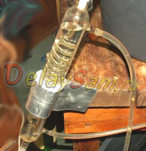 Значительно больше хлопот может возникнуть с конденсатором, именуемым чаще змеевиком. Самый идеальный вариант — это съездить в магазин химической посуды и купить змеевик — конденсатор из кварцевого стекла. Иногда из можно встретить на блошиных рынках или просто достать через знакомых из химичекой лаборатории.