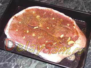 На луковые кольца укладываем свиной стейк из окорока, с косточкой. Толщина стейка – 3-5 см. Надкалываем стейк острым ножом и шпигуем его нарезанными на пластинки дольками чеснока. Сверху стейк солим и посыпаем специями. В качестве оных прекрасно подойдут перец и пряные травы, а так же карри. Если есть зелень (укроп, петрушка), можно положить и их. Вобщем, тут трудно переборщить. Ну а свои вкусы вы сами знаете.