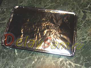 Противень со стейком накрываем фольгой и тщательно прижимаем ее к противню. Стараемся сделать небольшой желобок по периметру, что бы пар не выходил из противня. В фольге ножом делаем несколько надрезов (протыкаем в нескольких местах). И отправляем противень со стейком в духовку, прогретую до 180-200 градусов на 30-40 минут. Если вы любите стейк «с кровью», то на 25-30 минут.