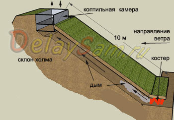 В старину, такие коптильни устраивали на склонах крутых холмов, обрывах и т.п. с наветренной стороны. Устраивая длинные дымоходы прямо в земле. Выкапывали по склону холма траншею, перекрывали ее сверху палками, ветками и закрывали снятым дерном. А ветер помогал задувать дым в эти дымоходы. На другом конце дымохода устраивалась коптильная камера.