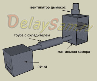 Сейчас, очевидно придется применять вентиляторы (дымососы) для создания тяги и специальные коллекторы, в которых дым будет остывать. Иногда топку такой коптильни устраивают в подвалах, так как длинный дымоход требует для своего обустройства много места.