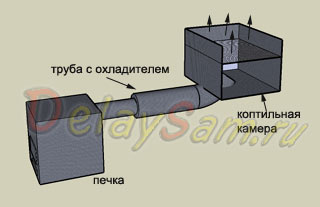 Коптильная камера оборудуется на конце трубы обычной печки буржуйки, в виде широкого короба (раструба) без крышки. При копчении продукты помещаются в районе выхода дыма из трубы, но так, что бы дым уже начинал в этом месте смешиваться с воздухом.