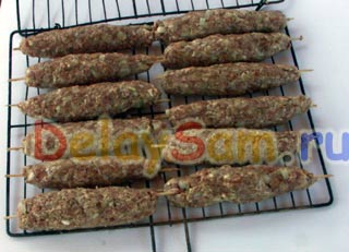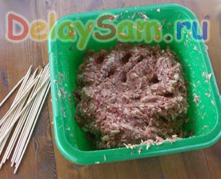 Люля-кебаб, как известно, готовится на шампурах. Мы возьмем деревянные шпажки, диной 25-30 см. И будем готовить кебаб на шпажках. Берем в руку горсть фарша и вылепливаем из него плотную колбаску такой длины, что бы шпажка выступала из нее на 2-3 см по торцам. Лепить можно сначала колбаску, а затем проткнуть ее шпажкой. А можно сразу — лепить колбаску вокруг шпажки. Диаметр колбасок кебаба — 3-4 см, не больше.