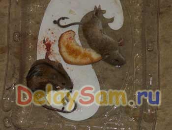 Ловушка делается просто. На поддончик выдавливается немного клея (как зубной пасты на щетку, примерно). Равномерно размазывается какой-нибудь щепочкой по поддончику. А в центр кладется кубик хлеба, смоченный несколькими каплями кунжутного масла. Вот и все. Мышей в этот поддон может попасться столько, сколько там сможет улечься. И никаких тебе «ложных срабатываний» или промаха, как в мышеловке. Если в поддон набьется несколько мышей – проще, конечно его выкинуть. А если одна-две — лучше их как то оторвать (я использую большие щипцы), а поддон и приманку использовать повторно.