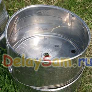 Подвижный барабан. Емкость примерно такого же объема (40-45 литров) из нержавейки, с сильно перфорированными краями. На его торце имеется ось, которую можно аккуратно срезать болгаркой или оставить. Загерметизировать этот барабан удастся вряд ли (да и стоит ли?), разве что выклеить его изнутри каким либо тонким пластиком.