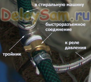 Тройник и всю остальную арматуру можно разместить непосредственно в месте установки стиральной машины и даже прикрепить к ее задней стенке с помощью саморезов по металлу. Провода со штепселем для подключения реле давления к сети можно через сетевой тройник включать вместе со шнуром питания машины. А насос подключать к проводу с розеткой (от реле давления) через удлинитель или сделать его заведомо достаточно длинным.
