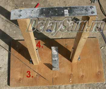 В центре фанеры (основания) просверлено отверстие, несколько большее, чем отверстие в металлической пластине, что бы толстая фанера не мешала срабатывать датчику (поз.1).