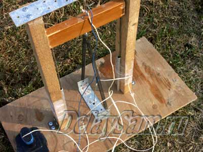 Установка кротобойки производится в следующем порядке. Изготавливается сторожок (их можно заготовить и впрок, штук 5-6), взводится пужины и фиксируются сторожком. После этого устанавливается датчик, прикручиваются провода к сторожку. Подключение источника питания производится в последнюю очередь и при полной уверенности, что датчик разомкнут!