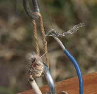 Вокруг шнура сделано несколько витков тонкой нихромовой проволоки (от нагревательной спирали). Длина проволоки – 3-4 см. Она должна гарантированно мгновенно раскалятся, пережигать капроновый шнур и перегорать сама, прерывая цепь. Поэтому и толщину нихрома, и источник питания надо выбирать соответствующий. Я использовал 18-ти вольтовый аккумулятор от аккумуляторной дрели. Можно, конечно, использовать и любой другой источник, хоть набор батареек.