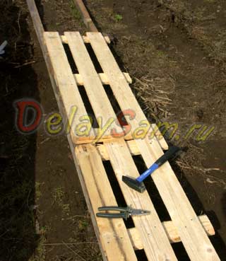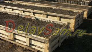 Чрезвычайно удобно оказалось использовать для изготовления таких высоких грядок товарные поддоны. Поддоны представляют собой деревянные щиты на ножках-досках и для их использования надо поддоны разобрать, а затем распилить щит на две половинки. Эти половинки сразу набиваются на каркас.