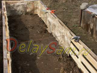 После того, как каркас грядки установлен на место, необходимо проделать еще 2 операции. Первая — необходимо как то защитить древесину от контакта с землей. Иначе она быстро сгниет, буквально за сезон или два. Для защиты сгодится старый линолеум, ПВХ – пленка, пластик, резина, рубероид. Вобщем, любой негниющий и желательно непромокающий материал. Его крепят к каркасу при помощи скоб, используя строительный степлер. Особой прочности крепления тут не требуется, так как впоследствии материал все равно прижмется грунтом к каркасу.