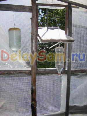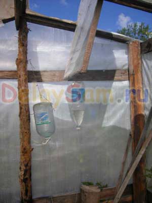 Важно что бы трубка соединяющая бутылки висела свободно при любом положении окна, и никакие растения её не задевали (особенно огурцы) когда вырастут иначе нарушится работа всей системы.