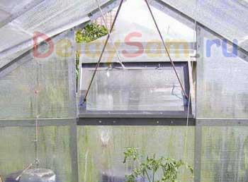 У меня на даче так сделаны три варианта окон: вертикальное, горизонтальное и типа откидной форточки наружу парника. На форточку пришлось установить резинку (или пружину) для её закрытия в свободном состоянии.