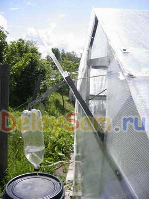 В парнике делается окно по типу мансардного с осью по середине рамы. Одна сторона этого окна (нижняя) делается чуть тяжелей что бы окно под собственным весом закрывалось. Его можно крепить как вертикально на торцевой стене, так и горизонтально на крыше парника — кому как удобней. На короткую или более лёгкую (верхнею) часть окна вешается малая бутылка — она то и будет открывать окно когда в неё поступит вода из большой бутылки. Днём 6 литровая бутыль нагреется. Тёплый воздух в ней расширяясь, вытеснит всю воду в малую бутыль. В результате когда вода в малой бутылке превысить вес более тяжёлой половины окна оно начнёт открываться и если температура будет дальше расти, то откроется совсем. Вечером всё происходит в обратном порядке. Остывая, воздух в большой бутылке разряжается, и бутыль «всасывает» в себя воду из малой. Она становится легче и окно под своей тяжестью закрывается.