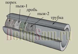 В дне гильзы имеется капсюль, затем идет заряд пороха, пыж, заряд дроби и крышка патрона. Теперь представим себе, что гильза представляет собой достаточно толстостенную трубку надежно заваренным торцом, а вместо капсюля применен небольшой кусочек нихромовой проволочки. Все остальное — как и у патрона. Провода к проволочке идут через саму «гильзу». Если на провода подать некоторое напряжение, то нихромовая проволока раскалится и порох загорится. А порох, как известно, прекрасно горит и без доступа воздуха, так как имеет в своем составе окислитель. Ну а дальше все происходит как при обычном выстреле из ружья. Пороховые газы выталкивают пыжи и дробь из гильзы и гонять по стволу и все они благополучно вылетают наружу с большой скоростью.