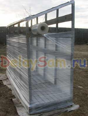 У меня уже был каркас огуречного парника (который ежегодно приходилось обивать новой полиэтиленовой пленкой). На этот раз я решил использовать упаковочную пленку типа стрейч. Повалив каркас набок, я начал с крыши. Край пленки фиксируется и начинаем обматывать плоскость крыши. Можно ее сделать однослойной, а можно и двухслойной (для лучшей теплоизоляции). Начинаем с той части крыши, которая будет ниже, что бы каждый следующий слой пленки образовывал нахлест на предыдущий слой (с напуском примерно 5-10 см) и воды не попадала бы внутрь парника. Крышу следует сделать потолще, в 5-8 слоев, так как зимой на ней будет лежать снег.