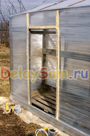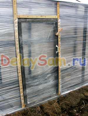 После того, как весь парник обмотан пленкой, предстоит сделать входную дверцу в парник (а затем – и вентиляционное окно). Для устройства дверцы в выбранном месте мы с помощью степлера «пристреливаем» скобами пленку к каркасу а затем прижимаем пленку к каркасу планками на саморезах. А затем прорезаем канцелярским ножом дверной проем. Вообще говоря, можно вставить дверцу заранее, а затем просто прорезать щель, что бы дверца могла открываться. Разумеется в этом случае надо будет прижать пленку планками и к дверце.