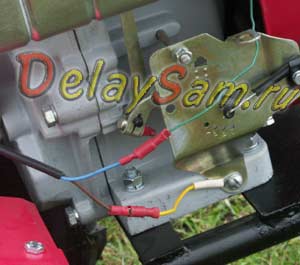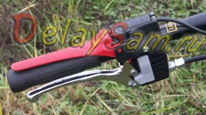 Другая особенность управления — это блокиратор зажигания. (красная ручка). Если ее бросить, то двигатель глохнет. Что бы как то обеспечить работу двигателя например в стоячем положении мотоблока, приходится выполнить целый перечень операций. Например, вам надо очистить культиваторы от накрутившейся травы или корней растений. Самая что ни на есть рядовая операция, при которй мотоблок должен стоять, но двигатель — работать. Дел-то на минуту. Не дергать же стартер всякий раз… На старом мотоблоке достаточно было просто бросит руль, и мотоблок останавливался. На HMБ-1 надо сначала выжать сцепление (мотоблок останавливается), переключить коробку передач на нейтральное положение, зафиксировать ручку сцепления и зажигания специальным пластиковым фиксатором (интересно, как долго он прослужит ). Возможно, требуется навык, возможно что то перемудрили… Покрайней мере, мастер сервис-центра Кадви, проводивший предпродажную подготовку и тест-драйв и опробацию мотоблока, посоветовал мне поставить тумблер, блокирующий работу блокиратора двигателя. Очевидно, не один я на эту заморочку обратил внимание.