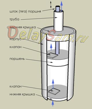По принципу действия он абсолютно идентичен «верховому» варианту, а вот в конструкции есть некоторые отличия. Сам насос по прежнему представляет собой корпус с поршнем, но основное отличие составляет то, что шток приводящий поршень в движение пропущен через выпускную трубу (которая переместилась на верхнюю крышку). Сама выпускная труба и шток имеют длину, позволяющую погрузить насос до воды с заглублением на 0,5-1 метр в слой воды. Мне известны случаю, когда длина трубы и штока была 36 метров(!) .