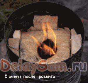 В третьих, печь достаточно безопасна в пожарном отношении, так как корпус ее нагревается несильно (горит где то внутри дров, а дерево хороший теплоизолятор), первые несколько минут ее вообще можно в руках держать. Если дрова «стреляют», то опять же внутри самих себя. Угли вниз не просыпаются, все сгорает буквально без следа. Хотя открытое пламя сверху есть открытое пламя, надо быть бдительным.